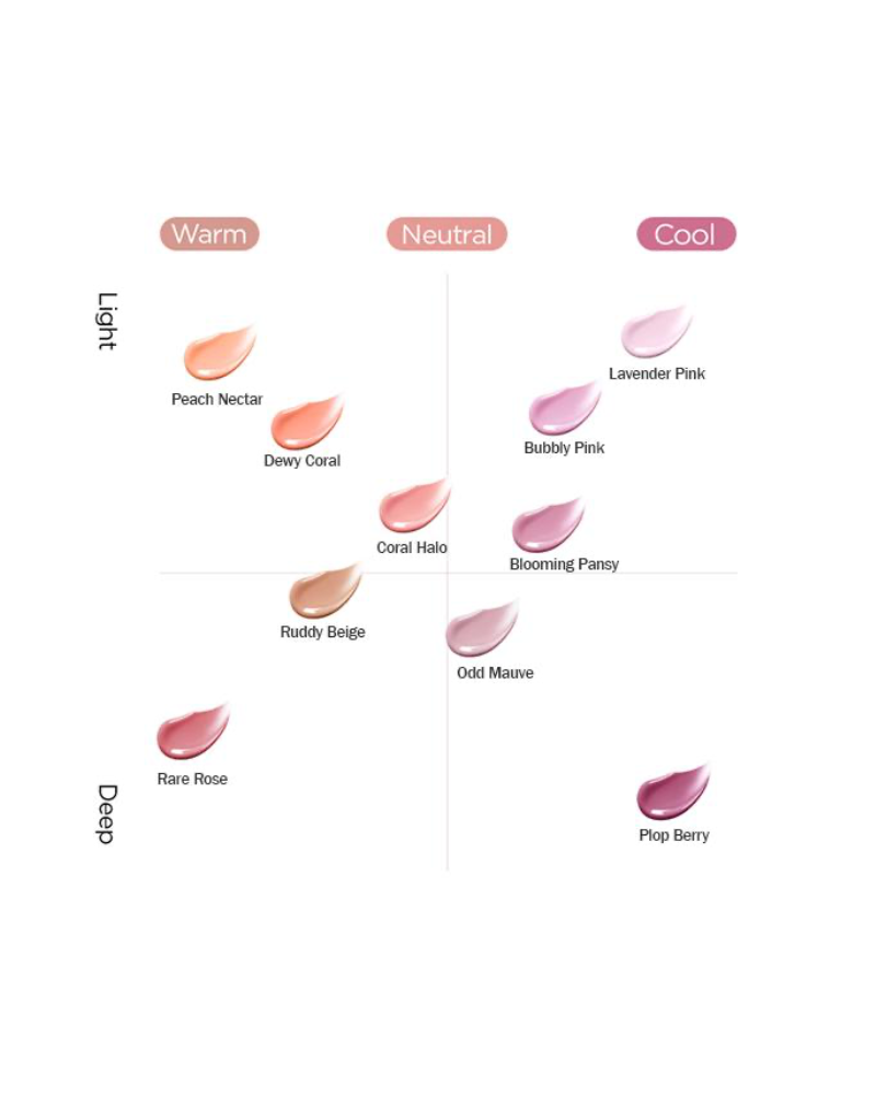[Dewy Coral] Purified Water, Diphenylsiloxyphenyl Trimethicone, Phenyl Trimethicone, Isotridecyl Isononanoate, Glycerin, Butylene Glycol, Polypropylsilsesquioxane, Cetyl PEG/PPG-10/1 Dimethicone, Isododecane, Trimethylsiloxysilicate, Diisostearyl Malate, Mica, Titanium Dioxide, Disteardimonium Hectorite, Hexyl Laurate, Polyglyceryl-4 Isostearate, PPG-17/IPDI/DMPA Copolymer, Sorbitan Olivate, Propanediol, 1,2-Hexanediol, Yellow 5 Lake, Caprylyl Glycol, Trisodium Ethylenediamine Disuccinate, Pentaerythrityl Tetra-di-t-butyl Hydroxyhydrocinnamate, Fragrance, Triethoxycaprylylsilane, Ethylhexylglycerin, Red 25 Lake, Red 20 Lake, Iron Oxides (Ci 75890), Panthenol, Hyaluronic Acid, Hydrolyzed Hyaluronic Acid, Sodium Hyaluronate, Lactobacillus Ferment, Peach Juice, Hexylene Glycol, Black Iron Oxide